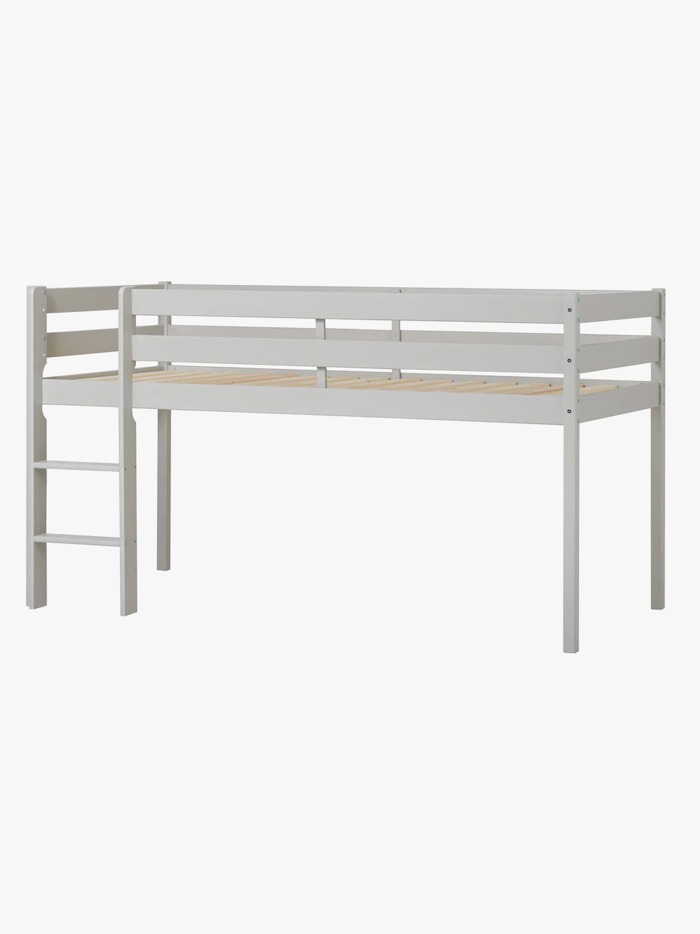 Loftseng fra Hoppekids med en komfortabel seng. Størrelsen på sengen gjør den perfekt for mindre barnerom eller til barn som ikke er helt klare for en vanlig seng ennå. Området under sengen kan brukes til oppbevaring eller gjøres om til en morsom lekehytte ved å henge opp en sengegardin. Høyde under sengen H 72 cm. - Stigen kan monteres både på høyre og venstre side.- Svanemerket.- Maksimal vekt: 60 kg.- Anbefalt maksimal madrasstykkelse: 9 cm.- Anbefalt alder: fra 6 år.- Furu.